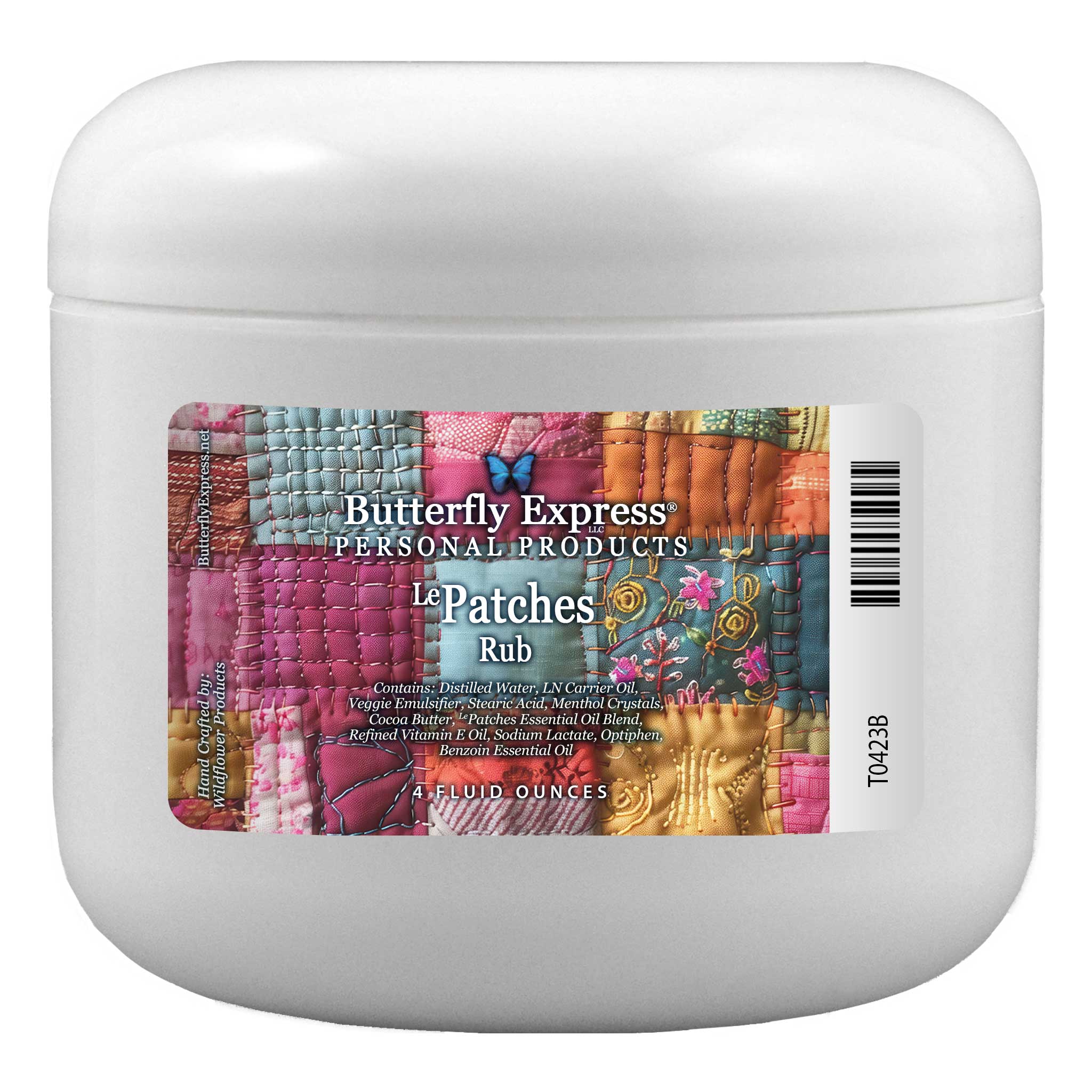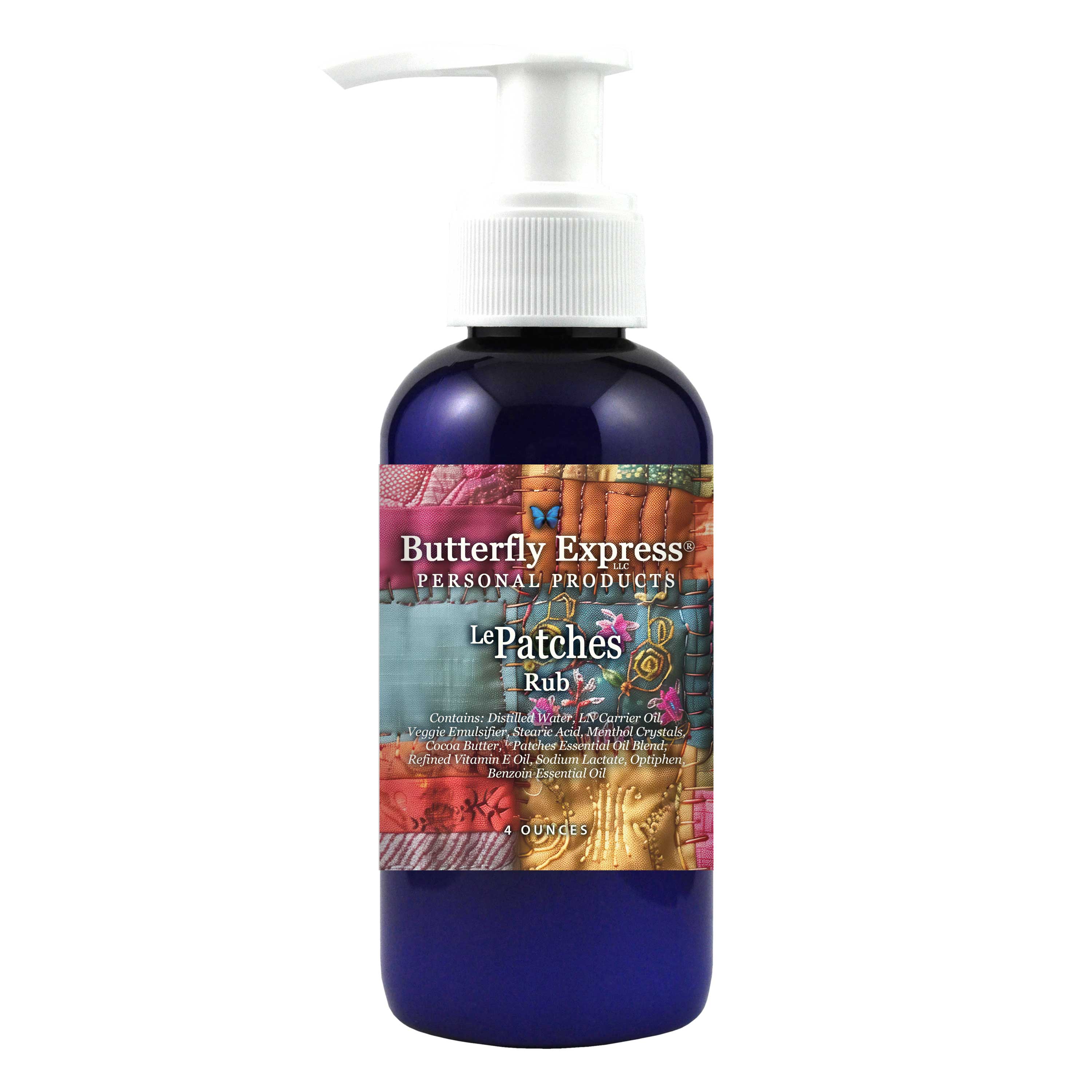 Distilled Water, LN Carrier Oil (Almond Oil Infused with Herbs: Comfrey, Arnica, St. John's Wort, Lobelia, Calendula, Angelica, Valerian, Ginger, Cayenne), Veggie Emulsifier, Stearic Acid, Menthol Crystals, Cocoa Butter, LePatches Essential Oil Blend (Frankincense, Gingergrass, Rosewood, Peppermint, Spruce Essential Oils), Refined Vitamin E Oil, Sodium Lactate, Optiphen, Benzoin Essential Oil