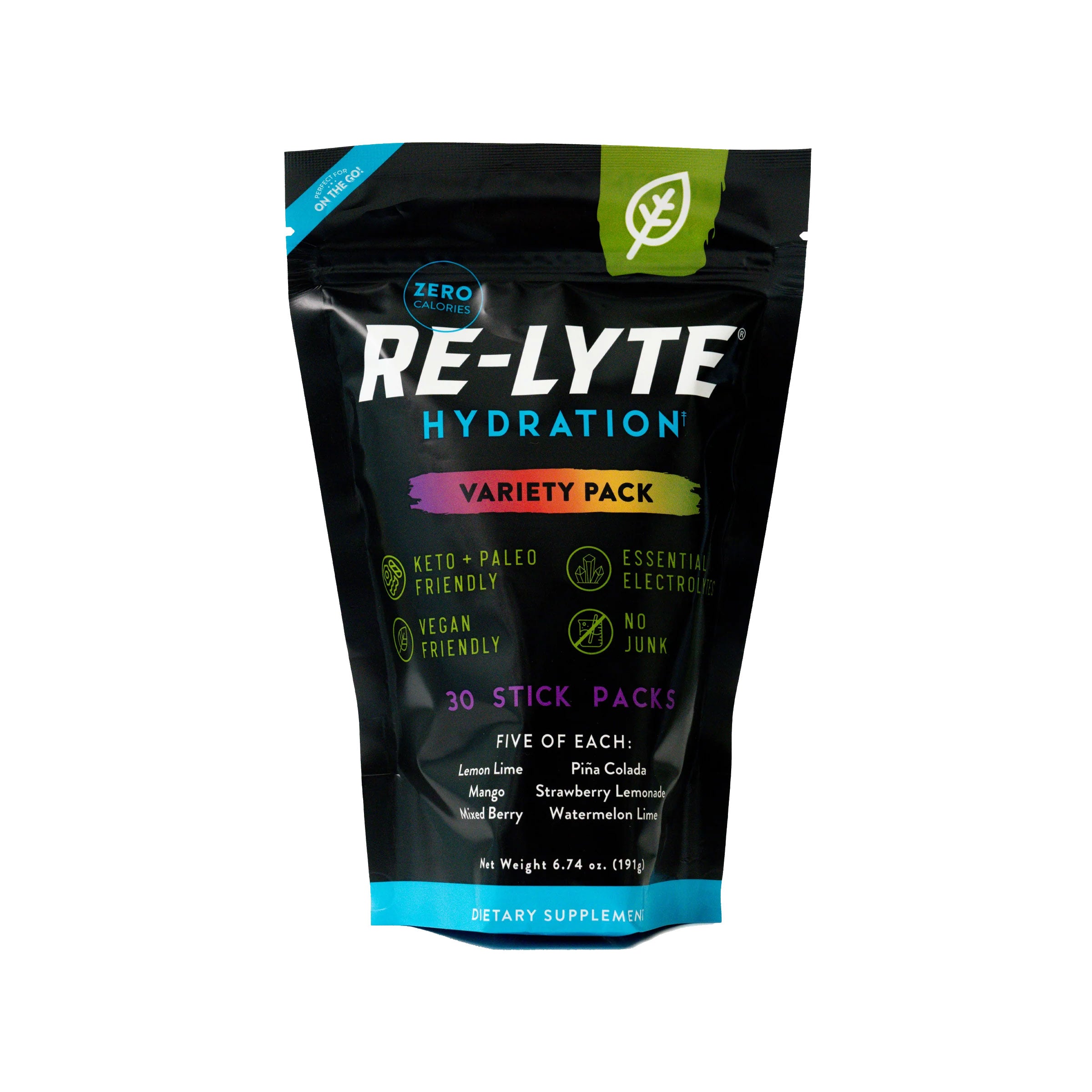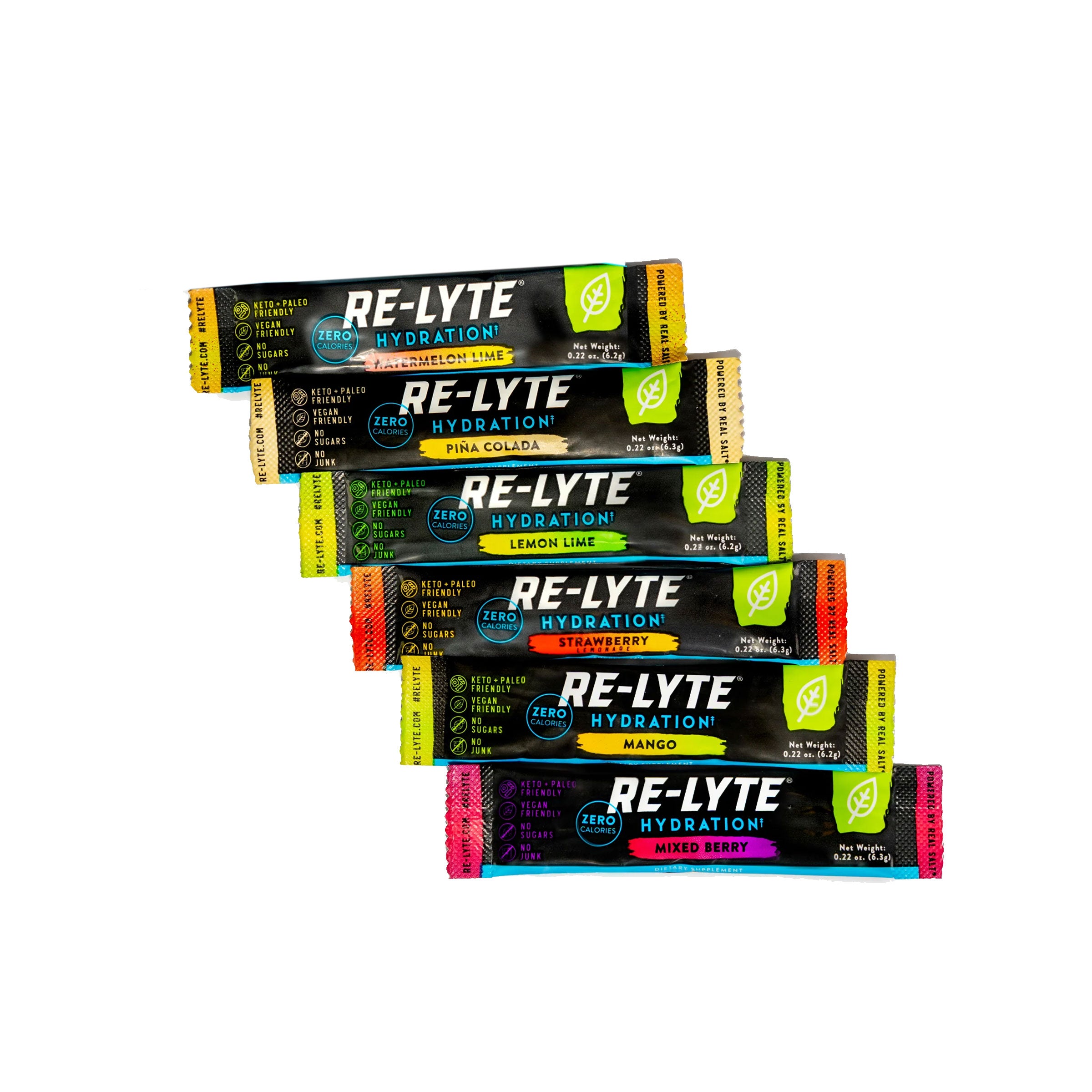 Our Re-Lyte® variety pack lets you try all six flavors of Re-Lyte® in convenient single-serving stick packs. Varieties include Lemon Lime, Mixed Berry, Pina Colada, Watermelon Lime, Strawberry Lemonade, and Mango.