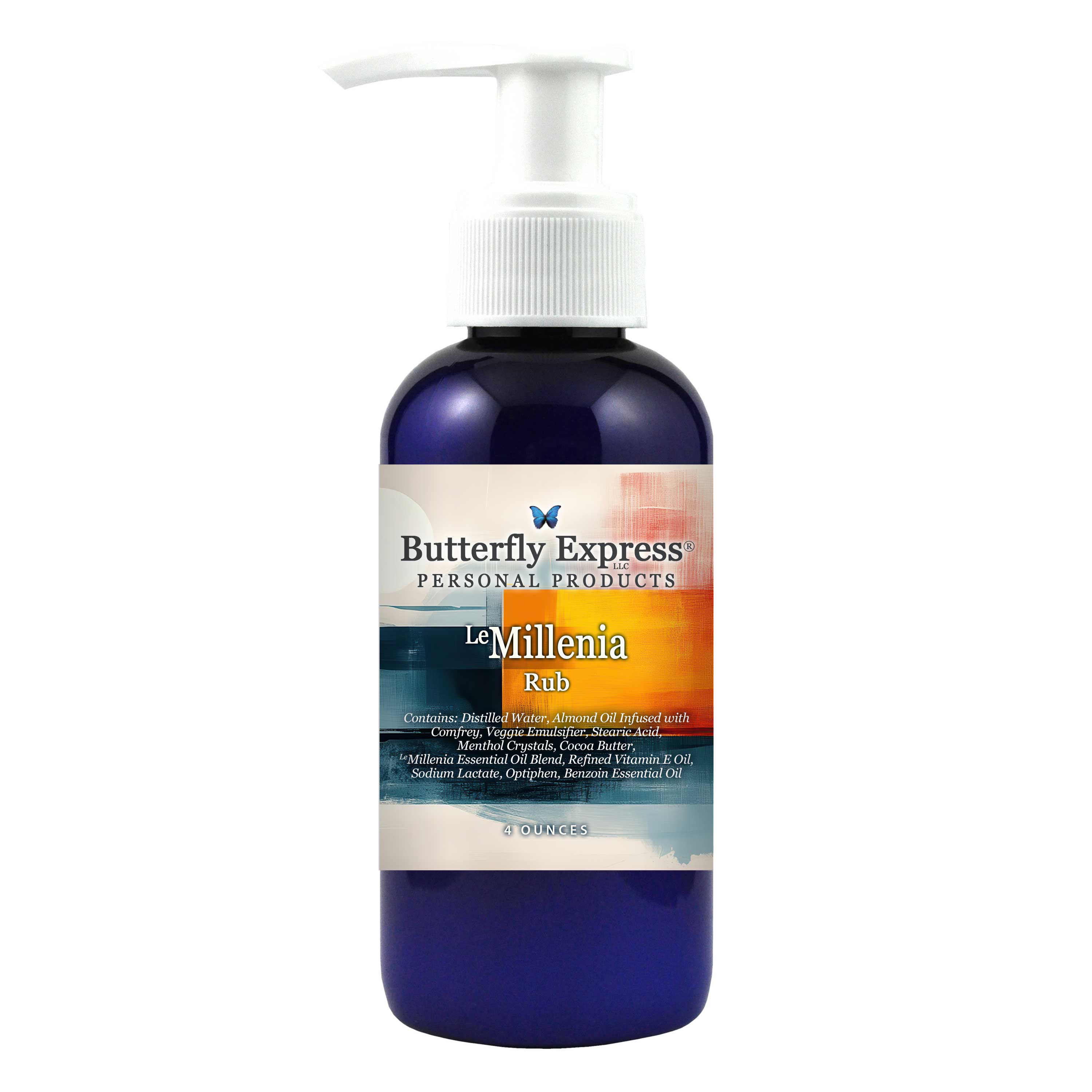 Distilled Water, Almond Oil Infused with Comfrey, Veggie Emulsifier, Stearic Acid, Menthol Crystals, Cocoa Butter, LeMillenia Essential Oil Blend (blue Tansy, Chamomile German, Elemi, Fir, Frankincense, Geranium, Lavender, Rosewood, Spruce,) Refined Vitamin E Oil, Sodium Lactate, Optiphen, Benzoin Essential Oil